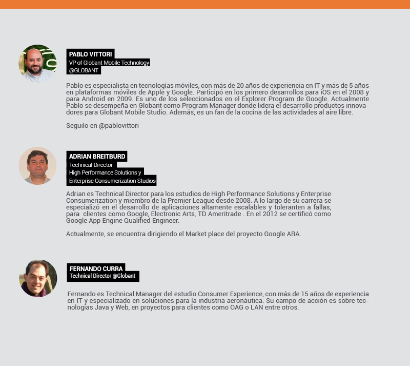 | ACERCA DE GLOBANT Somos un nuevo tipo de jugador entre las empresas de servicios de tecnología, enfocada en el desarrollo de soluciones de software innovadoras basadas en tecnologías y tendencias emergentes. Combinamos el rigor de la ingeniería y la tecnología de los proveedores IT con la mirada creativa y la cultura de las agencias digitales. Globant es el lugar donde la ingeniería, el diseño y la innovación se unen para llegar a gran escala. Para más información,www.globant.com |